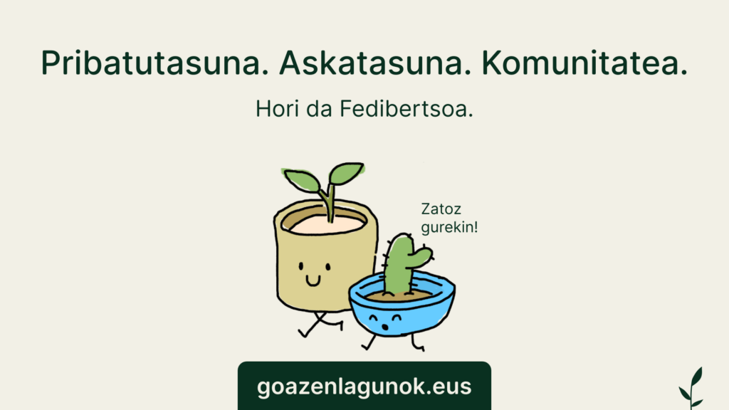 Fedibertsoa eraikitzen ari gara. Ez dauka sare sozial komertzialetan aurkitzen duzun hiperabiadura, dopamina edo eztabaida kopuru berdina. Eta ez da beharrezkoa, beste gauza bat delako: modu osasuntsuagoan eta gustagarriagoan topo egiteko, hitz egiteko eta harremanetan jartzeko espazio bat. Fedibertsoan lasai eta seguru gaude, eta merezi ditugun etorkizun digitalak elkarrekin eraikitzeko gaitasuna dugu.